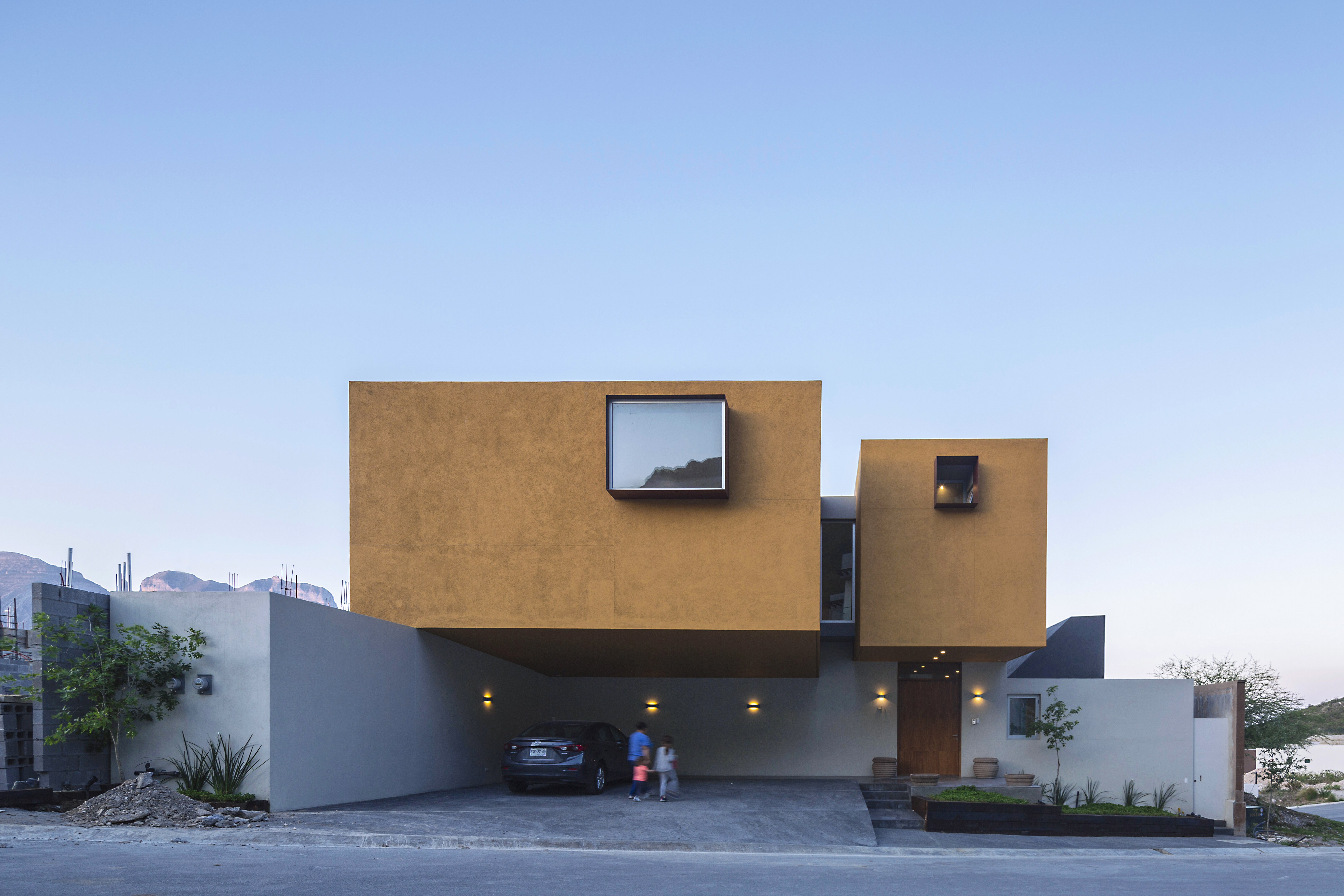 As one ascends the mountainside towards the house, its yellow volumes can be perceived as floating against the background of the sierra. The color takes its obvious meaning from springtime, coinciding with the flowers blooming in the same tone. As one approaches the back of the house, surrounds it and observes three of its façades, it’s perceived as closed and inclusive. In the front façade, the most hermetic, the volumes’ cantilever is surprising as an open frontal space that functions as both carport and outdoor reception in an elevation slightly higher than the sidewalk. Opening the door expands one’s view through the reception and the garden, carrying the eye north towards the Cerro de las Mitras. First, the reception grows towards a lateral garden and spreads towards the basement, a half bathroom, the formal social area, and the family area. Whilst advancing, one becomes aware that the entire first level is connected to the garden, and thus, open to the imposing city view. If one walks towards the pavilion that shelters the formal social area and enters the sloping volume compressed into an atrium by its low side, the view suddenly explodes towards the sierra through a large window. The low side connects to the garden, opening through a set of sliding glass doors.